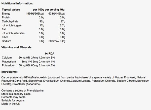 Nahrungsergänzungsmittel. Zutaten: Kohlenhydratmischung (92 %) (Maltodextrin {Maisstärkehydrolysat}), Fruktose), natürliche Aromen, Zitronensäure, Elektrolyte (2 %) (Natriumchlorid, Calciumlactat, Kaliumchlorid, Natriumcitrat, Magnesiumlactat), Süßstoff: Aspartam. Enthält Spuren von Phenylalanin. Dunkel und kühl lagern. Inhalt: 1600 g.